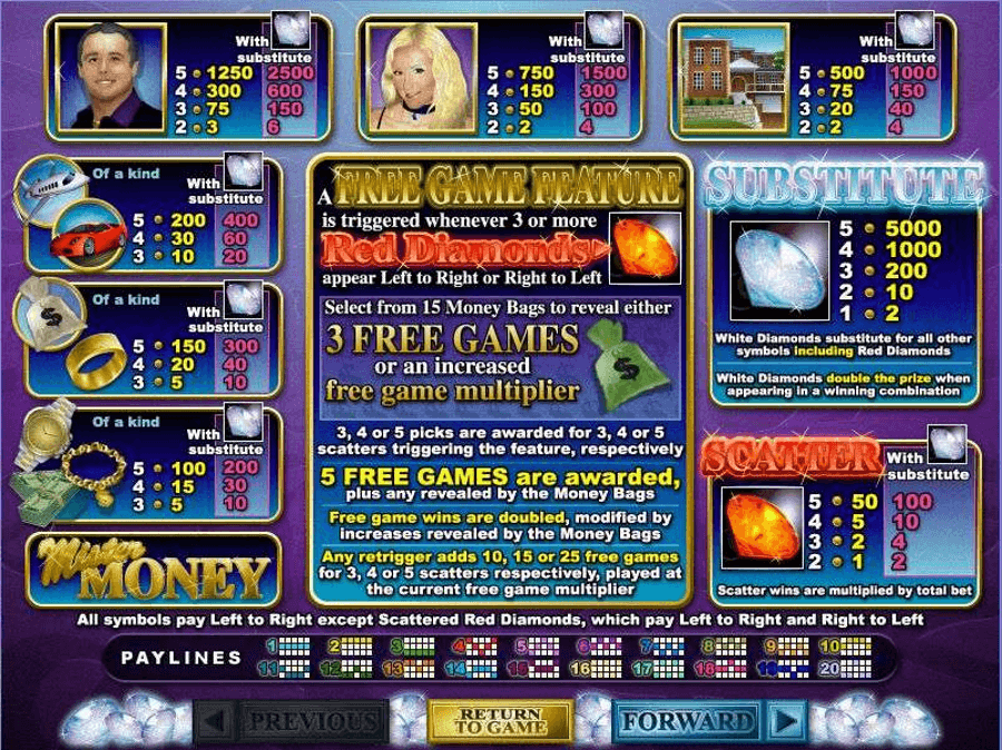 Revise short Mister Money slot review to figure out more about this particular casino game that portrays Gold, Diamond, Lucky, Fortune themed slots. Certainly, latter topics for casino players means heaps of great times created by all aspects and actions connected to themes.