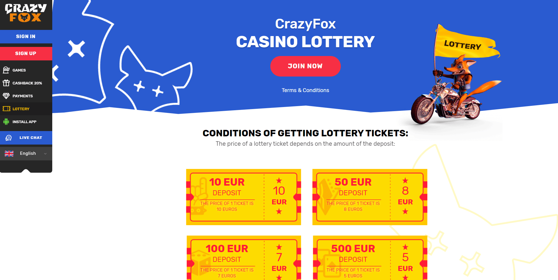 Crazy Fox Casino is a modern online casino site that offers an exclusive cashback bonus system to its players. It supports a variety of languages, payment methods, currencies, as well as a wide range of slots and casino games. Additionally, the website offers a downloadable version for some devices to enhance the gaming experience. Take advantage of the bonus and start playing at Crazy Fox Casino!