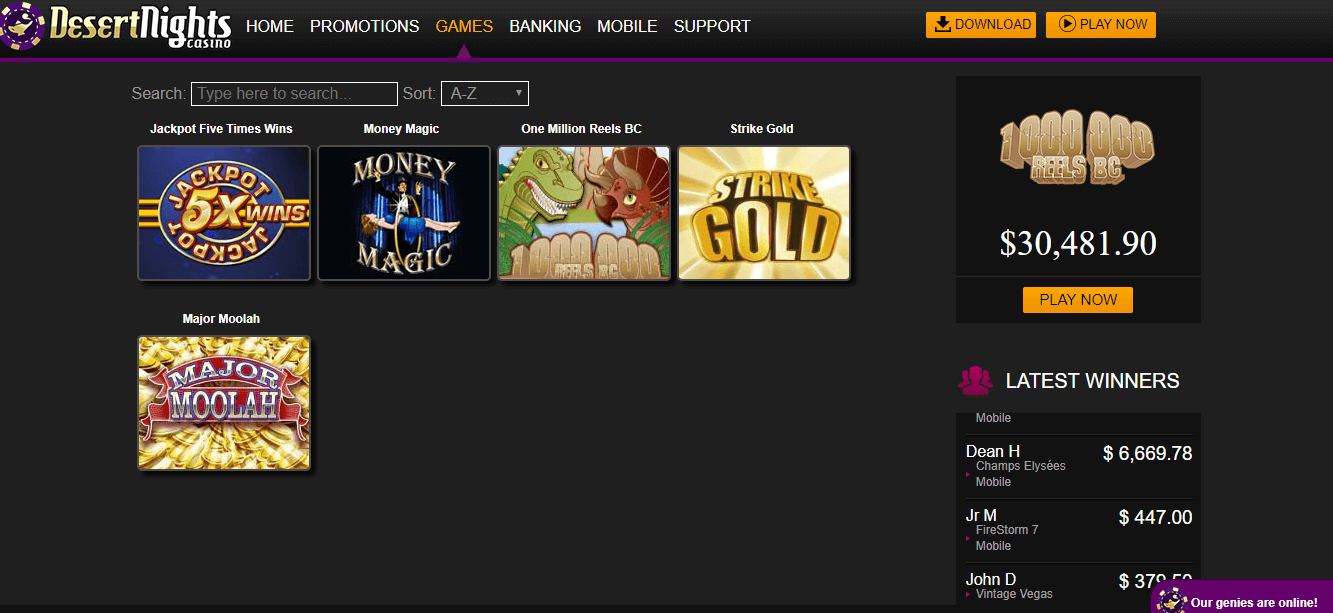 Desert Nights Casino welcomes fans of RTG and Rival slots with a great bonus. Try free slots with $10 Free no deposit bonus and continue with enormous, 250% up to $2,550 Welcome bonus. In addition, for loyal players casino offers download version for better gaming experiences and various ongoing promotions.
